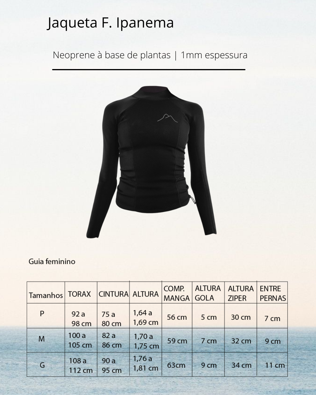 Jaqueta Ipanema tem espessura de 1mm com ajuste na barra lateral do produto e é ideal para águas de temperatura 18 a 23 graus com rajadas de vento. Ele é composto 60% borracha natural ( Material YULEX, à base de plantas) e 40% poliamida. O YULEX é feito de borracha natural que vem da seiva da seringueira ( Hevea Brasiliensis). Desenvolvido para ser usado no Surf, Kite, Bodyboard, entre outros esportes aquáticos.